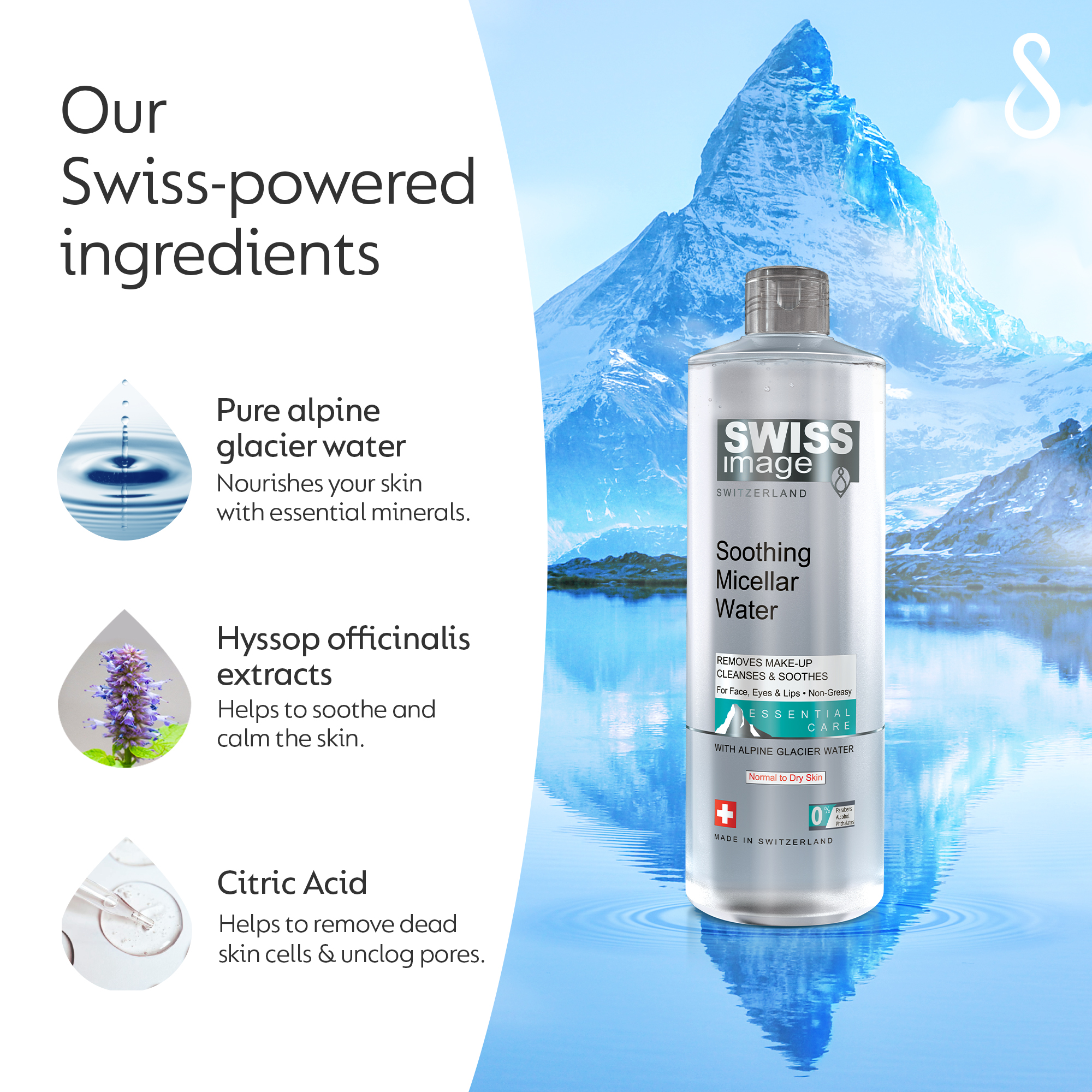 Бережное растворение макияжа: наша успокаивающая мицеллярная вода деликатно и легко растворяет макияж, в том числе стойкую тушь и стойкую основу, оставляя кожу чистой и свежей. Интенсивное увлажнение: погрузите кожу в волну влаги! Наша мицеллярная вода, разработанная для нормальной и сухой кожи, обеспечивает глубокое увлажнение, уменьшение сухости и придание коже упругости и сияния. Не смывайте, не беспокойтесь: формула нашей мицеллярной воды, не требующая смывания, обеспечивает удобство использования. Просто нанесите и позвольте успокаивающему раствору творить чудеса, оставляя вашу кожу свежей без необходимости смывания. Восстанавливает баланс pH кожи: наша мицеллярная вода поддерживает естественный баланс pH вашей кожи, способствуя здоровому и упругому цвету лица. Наслаждайтесь успокаивающим эффектом, не нарушая гармонию вашей кожи. Вдохновленные природой ингредиенты: эта мицеллярная вода обогащена полезными свойствами экстракта иссопа, который мягко удаляет загрязнения, макияж и излишки кожного сала, оставляя вашу кожу чистой и обновленной. Лимонная кислота — мягкое отшелушивающее средство, которое помогает осветлить кожу. Швейцарская альпийская ледниковая вода глубоко увлажняет и питает кожу. Swiss Excellence: эта мицеллярная вода насыщена натуральными экстрактами, полученными из нетронутой экологической среды Швейцарии, включая альпийскую ледниковую воду и иссоп.