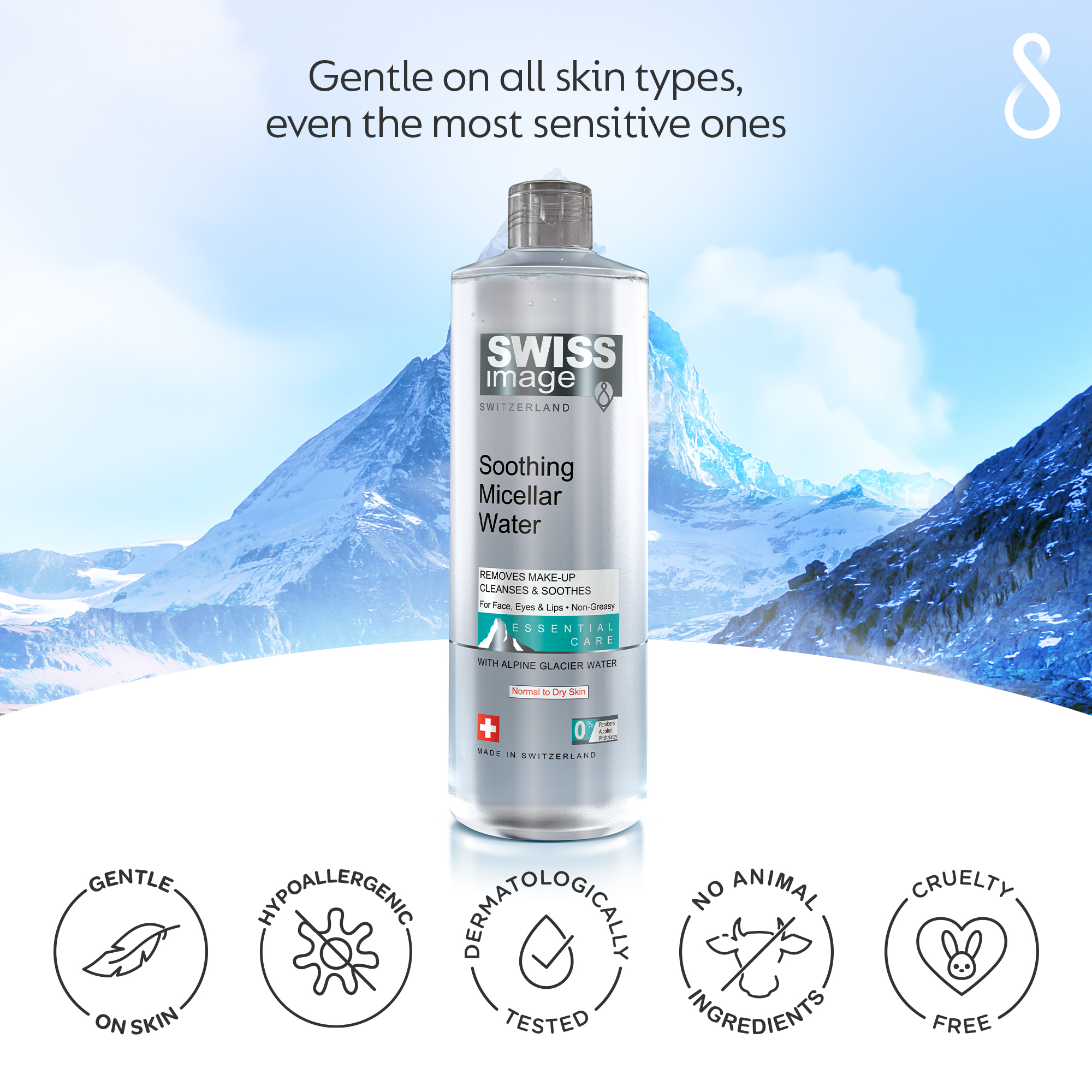Swiss Image Успокаивающая мицеллярная вода 400 мл | Нежное средство для снятия макияжа и очищающее средство | Успокаивает раздражение, уменьшает покраснения и успокаивает кожу | Несмываемая формула для нормальной и сухой кожи | Сделано в Швейцарии