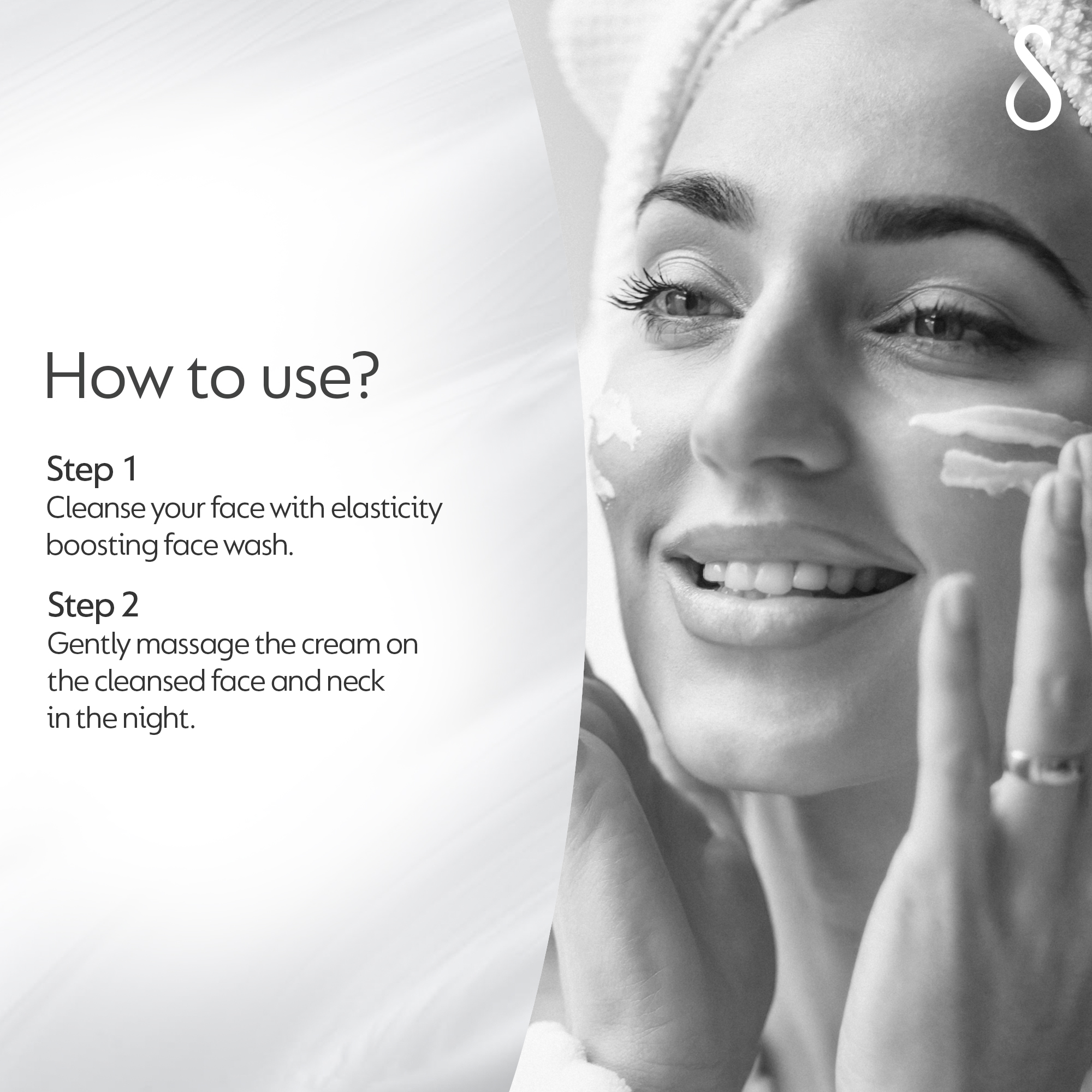 Шаг 1 Очистите лицо с помощью средства для умывания, повышающего эластичность. Шаг 2 Утром легкими массирующими движениями нанести крем на очищенное лицо и шею.