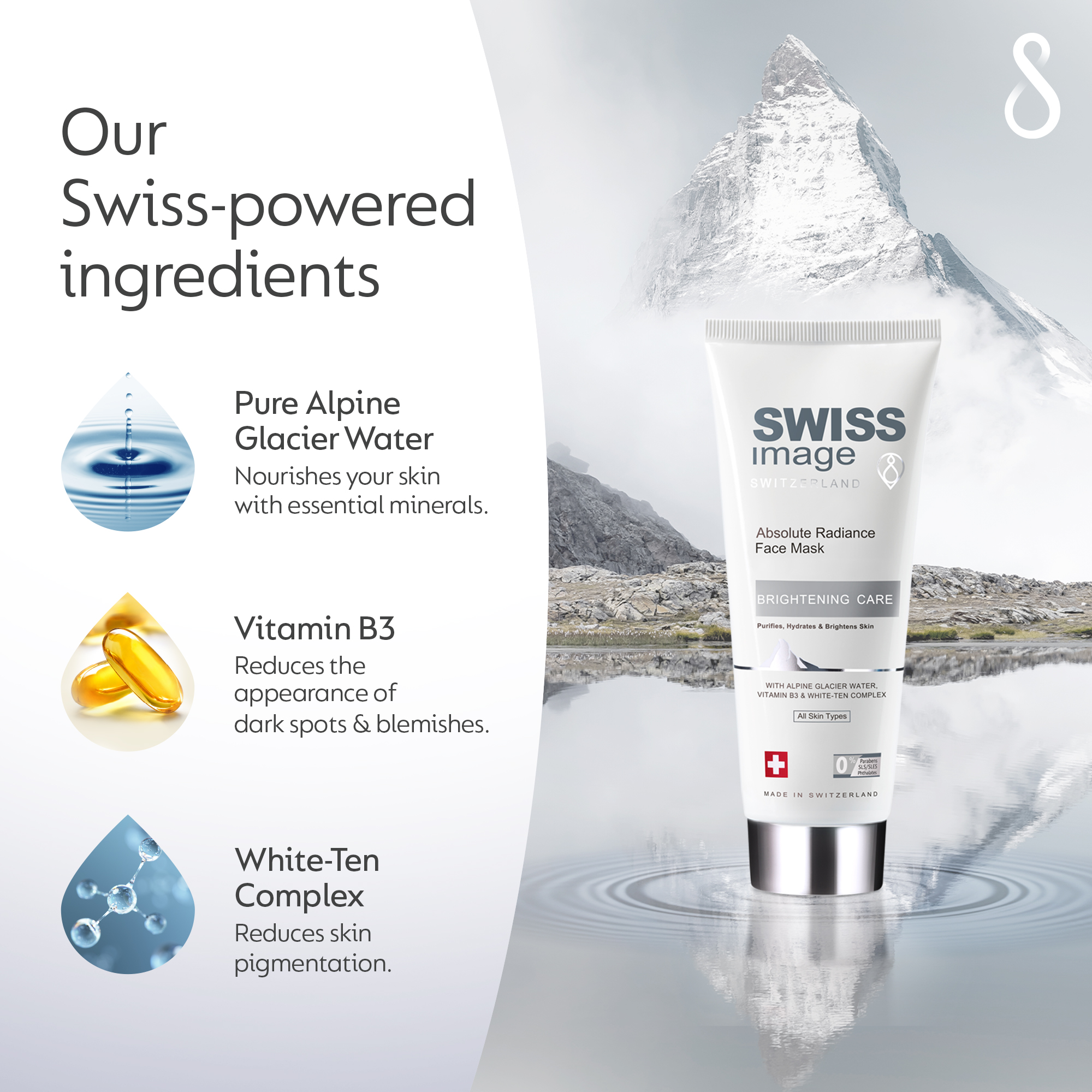 Осветление и выравнивание тонуса: эта маска помогает уменьшить темные пятна и неравномерную пигментацию, делая тон кожи более ярким и ровным. Оживление и очищение: экстракт White Ten омолаживает и очищает кожу, придавая ей обновленный и обновленный вид. Глубокое увлажнение: эта маска, наполненная альпийской ледниковой водой, обеспечивает интенсивное увлажнение, делая кожу эластичной, пухлой и омоложенной. Питание и омоложение: смесь мощных ингредиентов этой маски питает кожу, обновляя ее, придавая ей сияющий и обновленный вид. Натуральные ингредиенты: эта маска обогащена витамином B3, который помогает улучшить эластичность кожи, уменьшает появление темных пятен и выравнивает тон кожи. Вода альпийского ледника помогает восполнить влагу, делая вашу кожу упругой, эластичной и обновленной. Белый тен помогает осветлить кожу, уменьшить появление пигментных пятен и сделать цвет лица более ровным. SWISS EXCELLENCE: эта осветляющая маска Swiss Image Absolute Radiance наполнена натуральными экстрактами, полученными из нетронутой экологической среды Швейцарии, включая альпийскую ледниковую воду и White Ten.