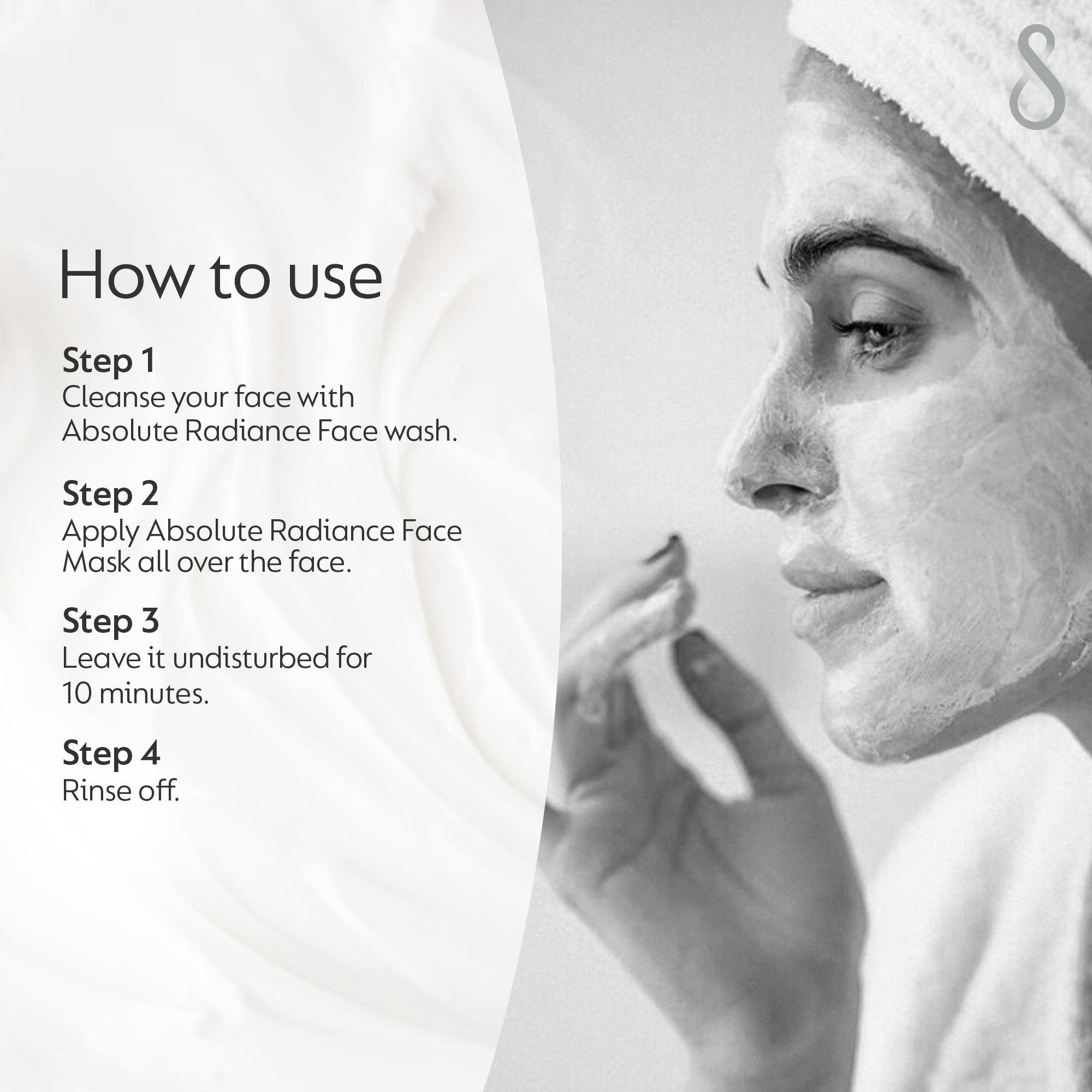 Шаг 1 Очистите лицо с помощью средства для умывания Absolute Radiance Face Wash. Шаг 2 Нанесите маску на лицо. Шаг 3 Оставьте его в покое на 10 минут. Шаг 4 Смыть
