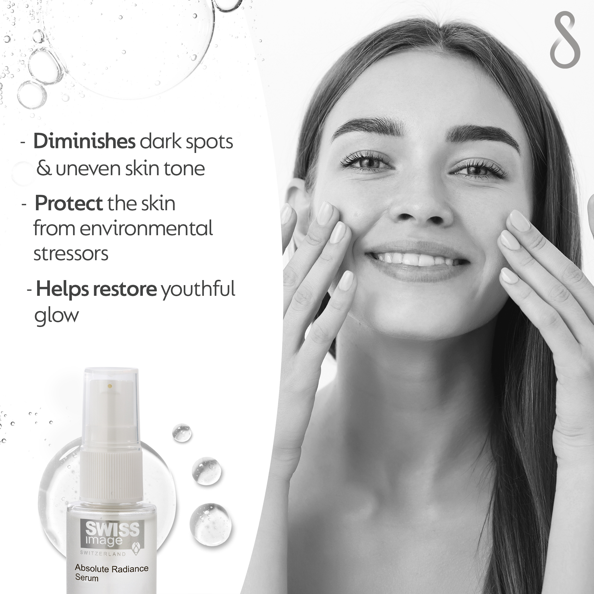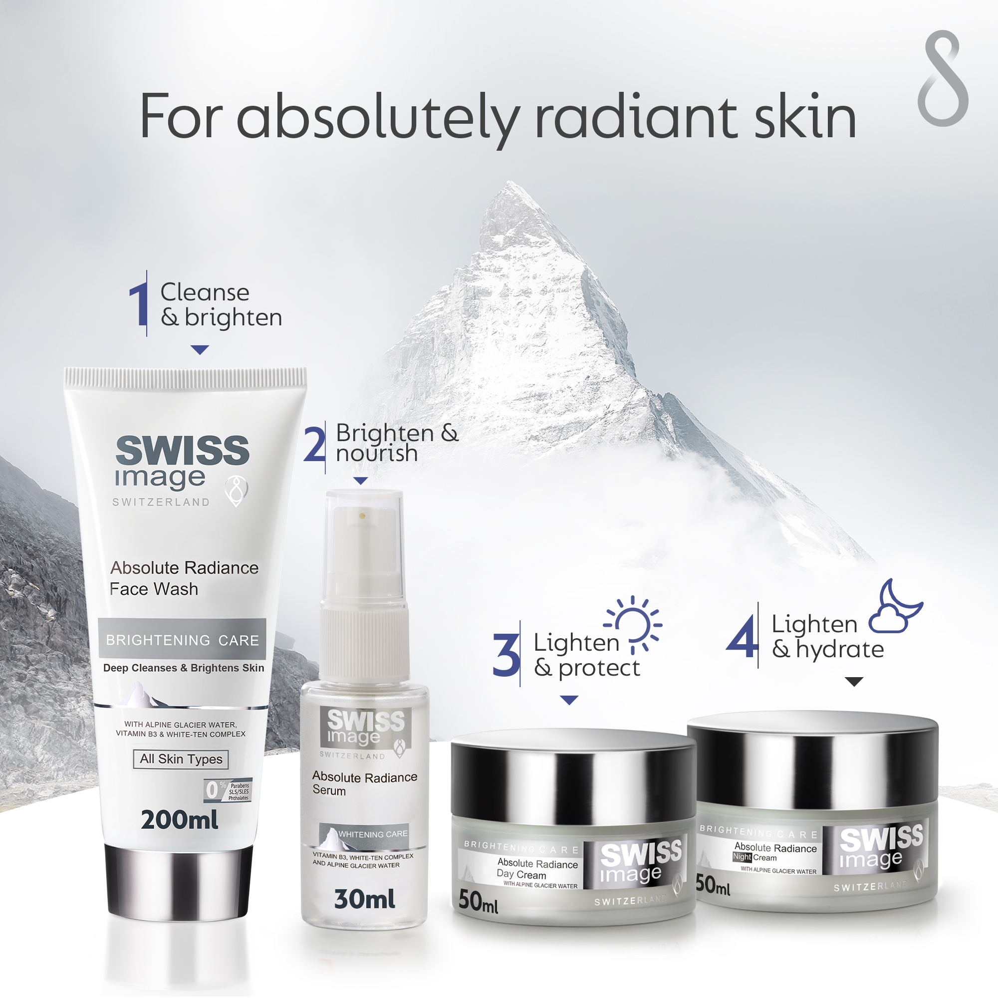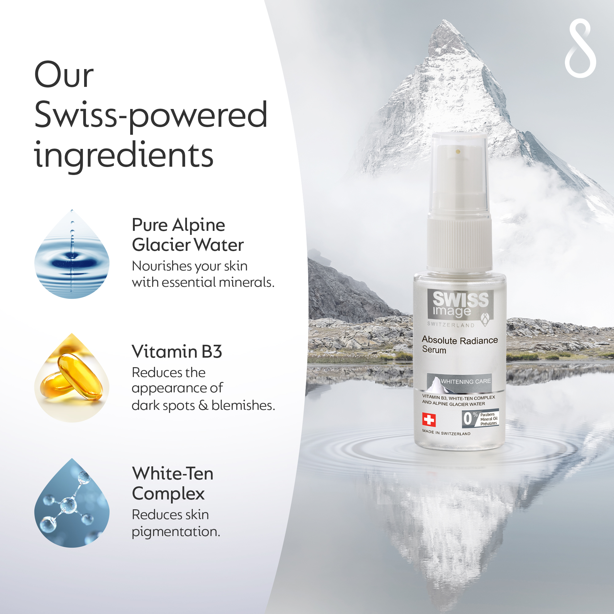 Осветляет и оживляет: мощное сочетание витамина B3 и комплекса White Ten активно борется с тусклостью, придавая лицу обновленный и сияющий цвет. Ощутите заметное уменьшение темных пятен и общее улучшение сияния кожи. Увлажняющий настой: альпийская ледниковая вода обеспечивает глубокое увлажнение кожи, придавая ей эластичный и сияющий вид. Эта сыворотка поддерживает оптимальный уровень влаги для пухлости и здорового сияния. Осветляющая сила: витамин B3 действует как мощный союзник в борьбе с темными пятнами и неровным тоном кожи, способствуя более яркому и сияющему цвету лица. Многофункциональное осветление: комплекс White Ten устраняет обесцвечивание под разными углами, обеспечивая комплексное решение для более ровного тона кожи. Натуральные ингредиенты: эта сыворотка обогащена витамином B3, который помогает улучшить эластичность кожи, уменьшает появление тонких линий и морщин и выравнивает тон кожи. Вода альпийского ледника помогает восполнить влагу, делая вашу кожу упругой, эластичной и обновленной. Комплекс White Ten помогает осветлить кожу, уменьшить появление пигментных пятен и сделать цвет лица более ровным. SWISS EXCELLENCE: эта осветляющая сыворотка Swiss Image Absolute Radiance наполнена натуральными экстрактами, полученными из нетронутой экологической среды Швейцарии, включая альпийскую ледниковую воду и White Ten.
