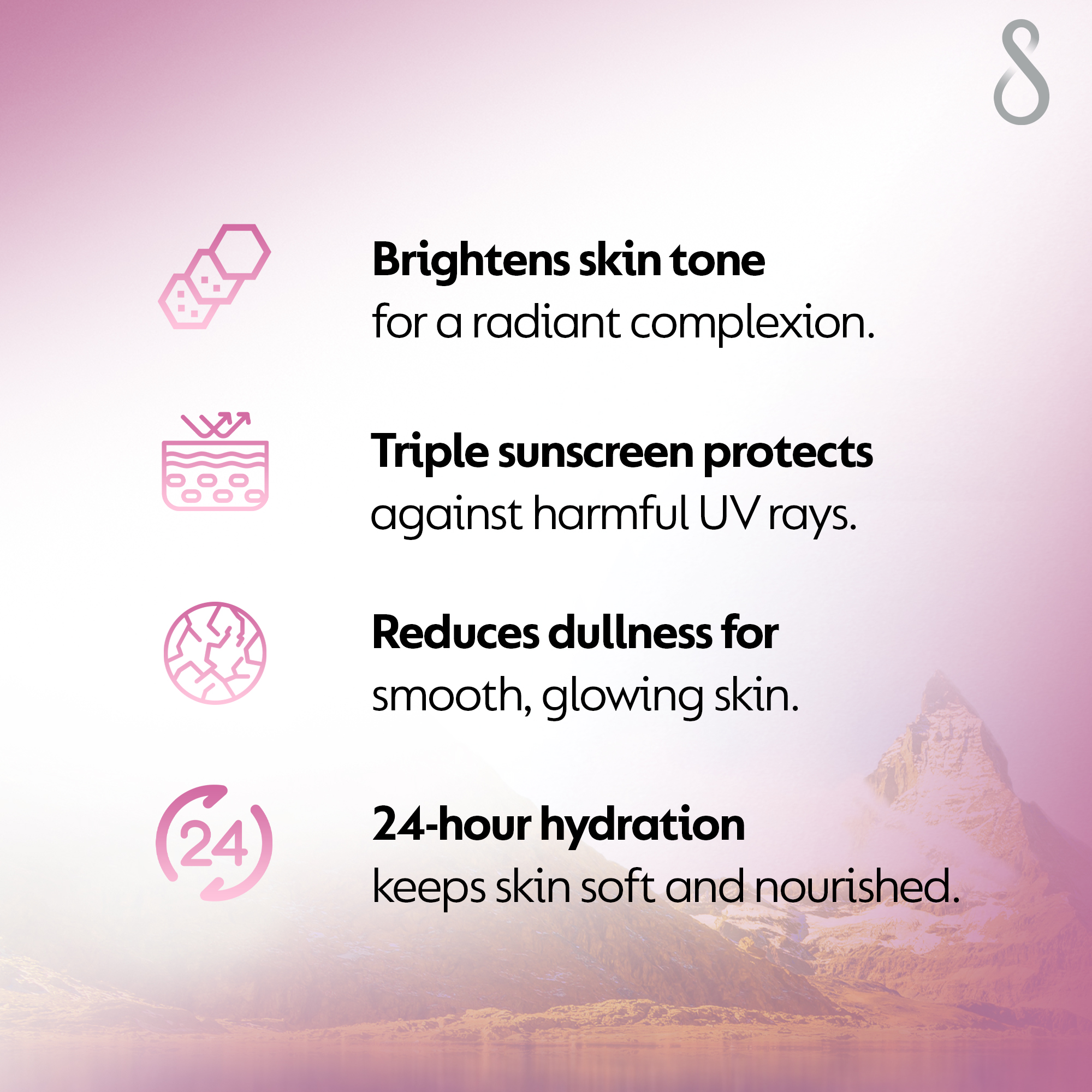 Осветляет тон кожи 24-часовое увлажнение Уменьшает тусклость Тройной солнцезащитный крем защищает от вредных ультрафиолетовых лучей.