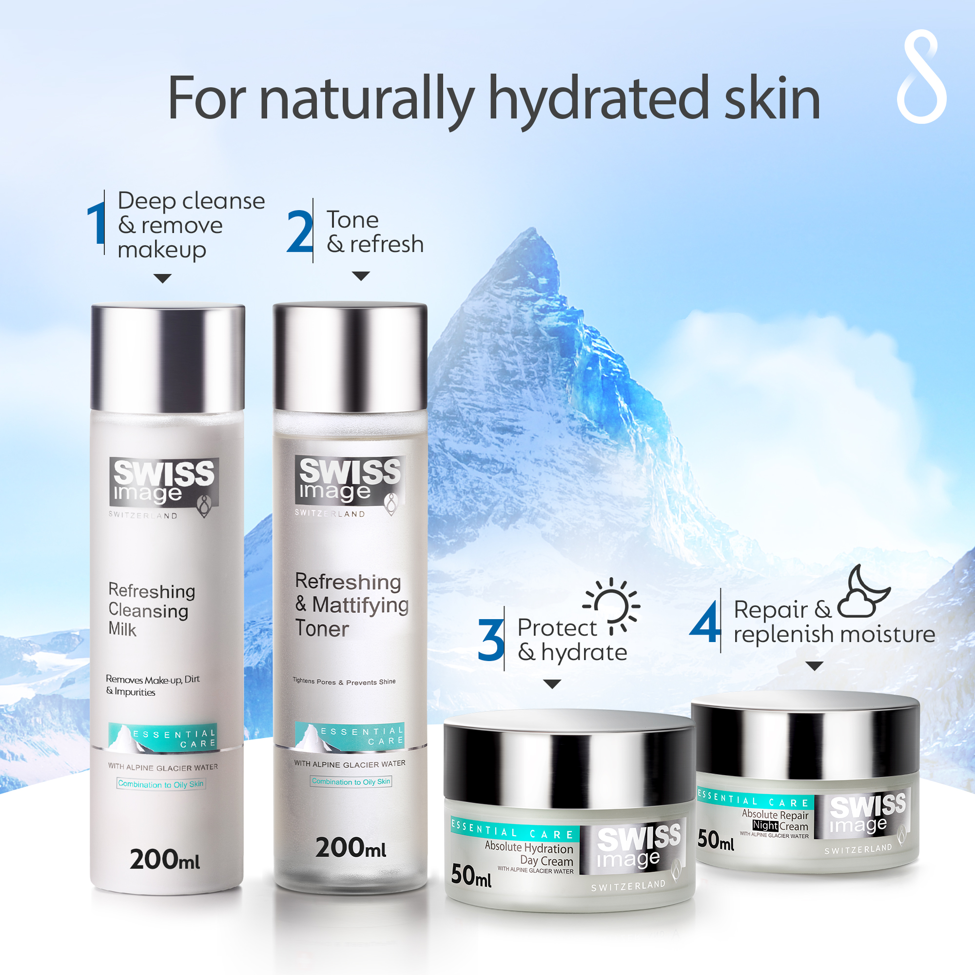 Swiss Image Освежающее очищающее молочко 200 мл | Нежирное, нежное очищающее средство для лица и средство для снятия макияжа | Очищает, осветляет, балансирует жир и удаляет загрязнения | Сочетанная и жирная кожа | Сделано в Швейцарии