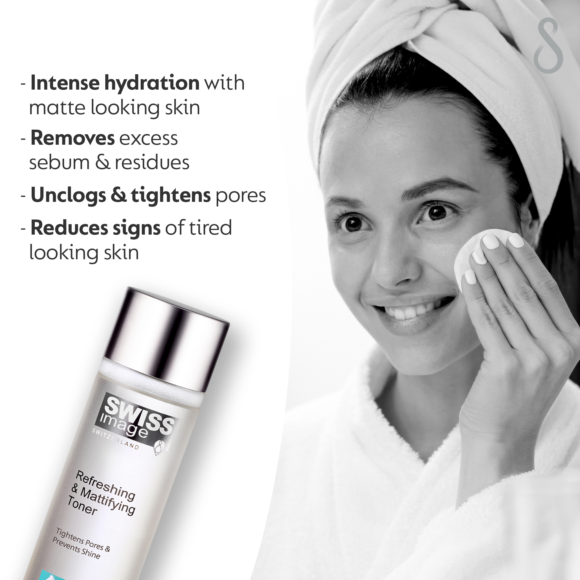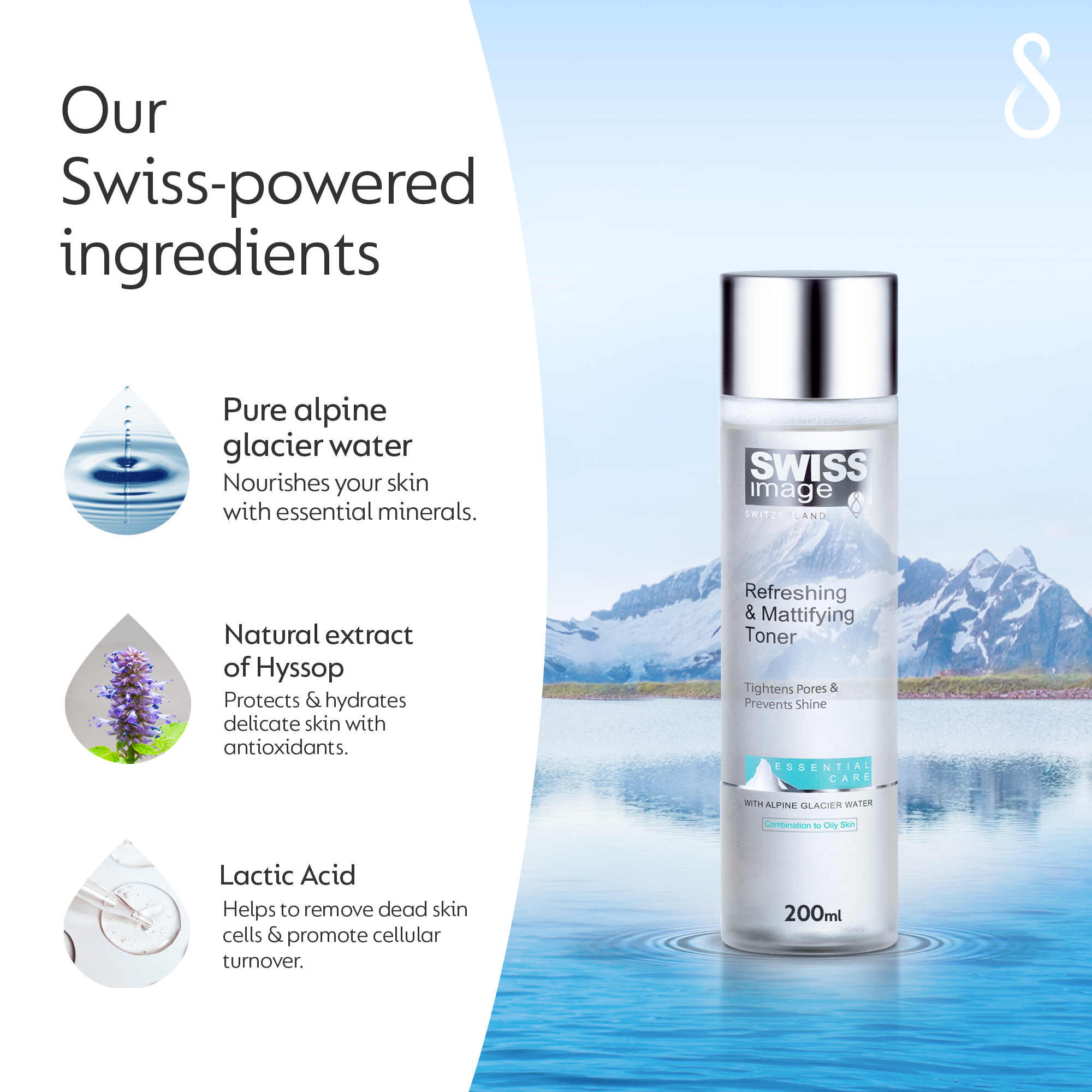 Swiss Image Тоник для лица освежающий и матирующий 200 мл | Контроль жирности, сужение пор и успокоение кожи | Увлажняющий тоник для лица для жирной, склонной к акне и комбинированной кожи | Для мужчин и женщин | Сделано в Швейцарии