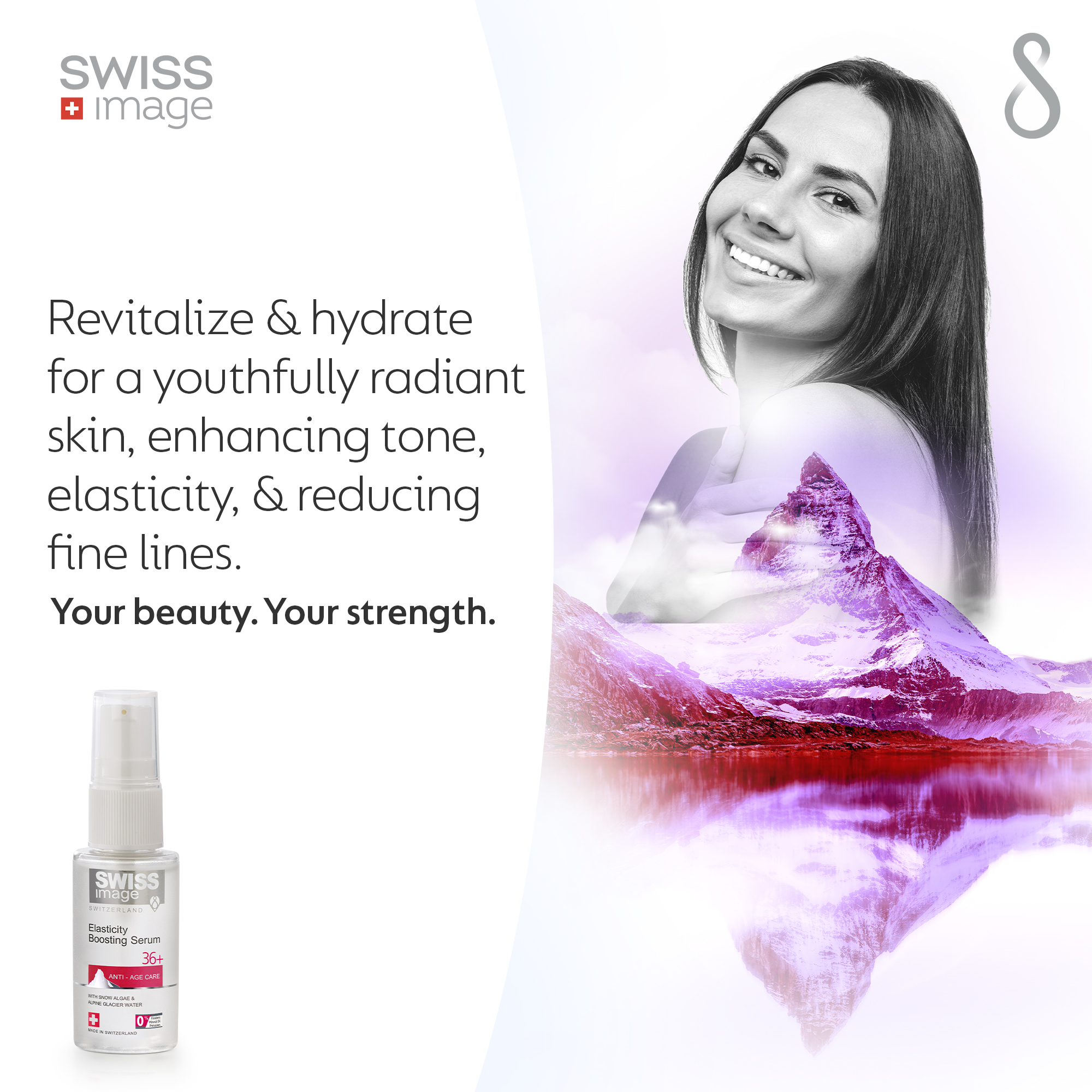 Антивозрастное действие: эта сыворотка помогает замедлить процесс старения, делает кожу молодой и сияющей, а также повышает ее увлажненность, делая кожу мягкой, гладкой и упругой для молодой кожи. Нежирная и легкая: эта антивозрастная сыворотка представляет собой легкую сыворотку, которая не оставляет кожу жирной и делает ее более упругой. Уменьшите тонкие линии и морщины: заметно уменьшает образование тонких линий и морщин. Делает кожу гладкой, ровной и молодой. Способствует выработке коллагена: эта сыворотка стимулирует регенерацию клеток кожи и способствует выработке коллагена. Вдохновленные природой ингредиенты: эта сыворотка обогащена полезной водой альпийского ледника, которая глубоко увлажняет и питает вашу кожу, придавая ей ощущение свежести и оживления. Снежные водоросли помогают повысить эластичность кожи, уменьшить появление тонких линий и морщин и сделать цвет лица более молодым. Гиалуроновая кислота помогает восстановить баланс влаги и разглаживает поверхность кожи. SWISS EXCELLENCE: эта сыворотка для повышения эластичности Swiss image обогащена натуральными экстрактами, полученными из нетронутой экологической среды Швейцарии, включая альпийскую ледниковую воду и снежные водоросли.