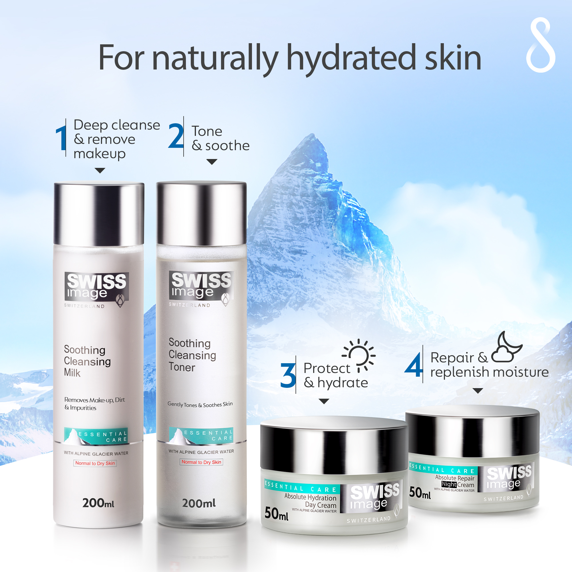 Swiss Image Успокаивающее очищающее молочко 200 мл | Нежирное нежное очищающее средство для лица и средство для снятия макияжа | Увлажняет, успокаивает, осветляет и удаляет загрязнения | Для нормальной и сухой кожи | Сделано в Швейцарии | Мужчины и женщины