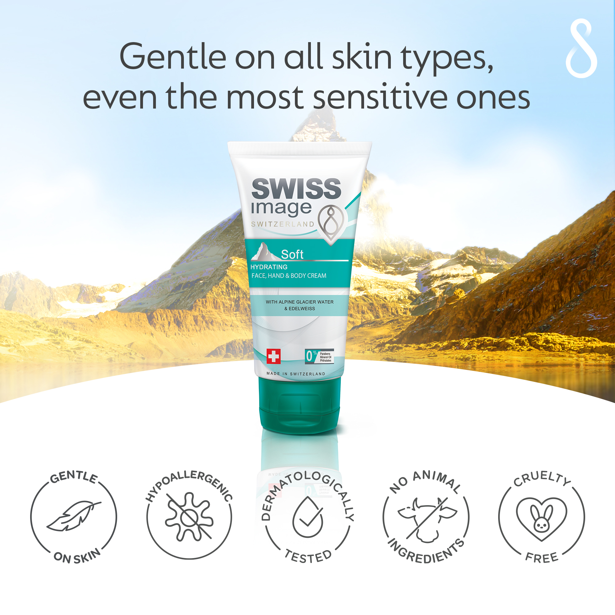 Swiss Image Мягкий увлажняющий крем для рук и тела 75 мл | Мгновенное увлажнение и нежирность, обогащенная альпийской ледниковой водой и эдельвейсом для ежедневного использования.